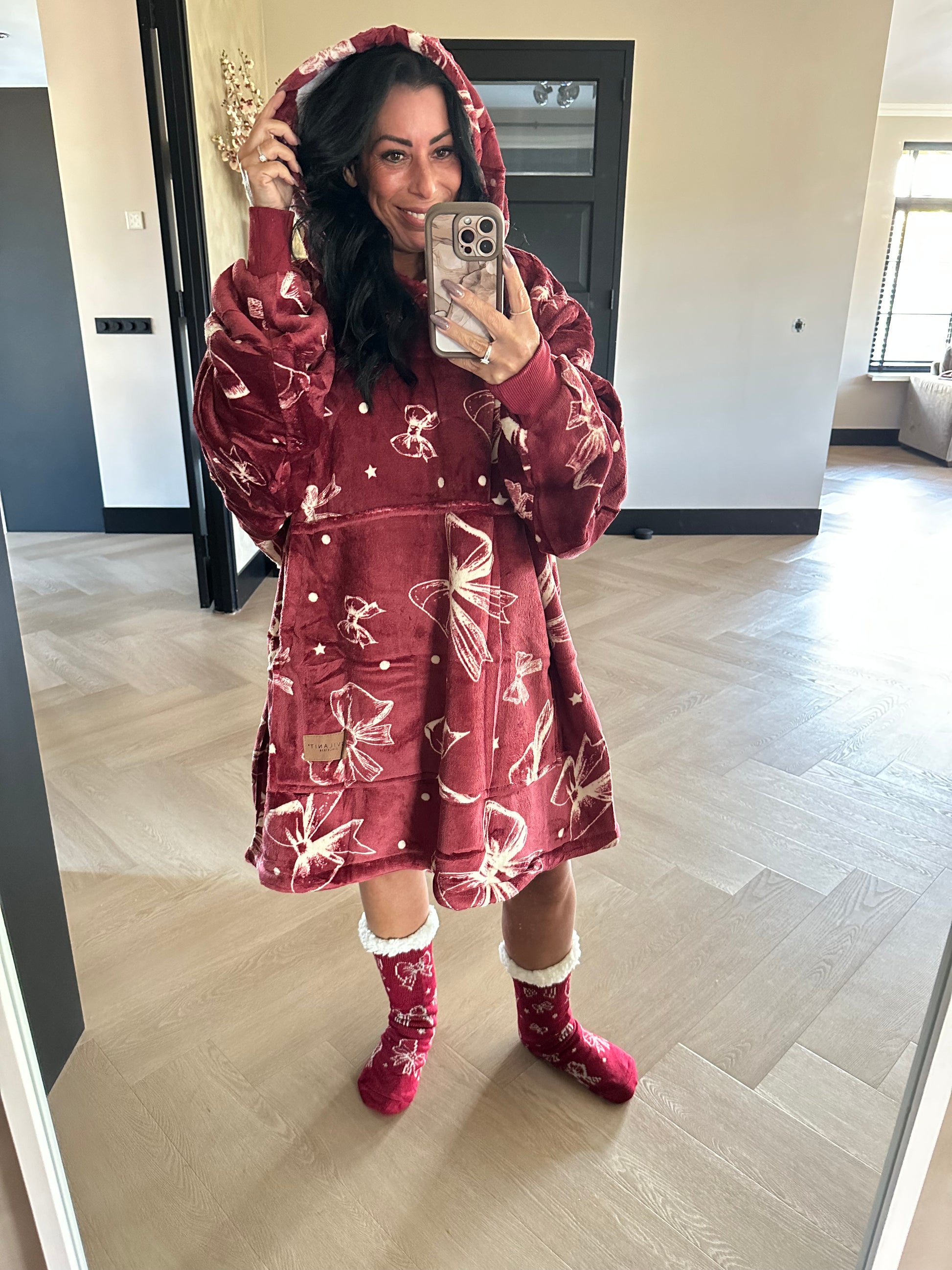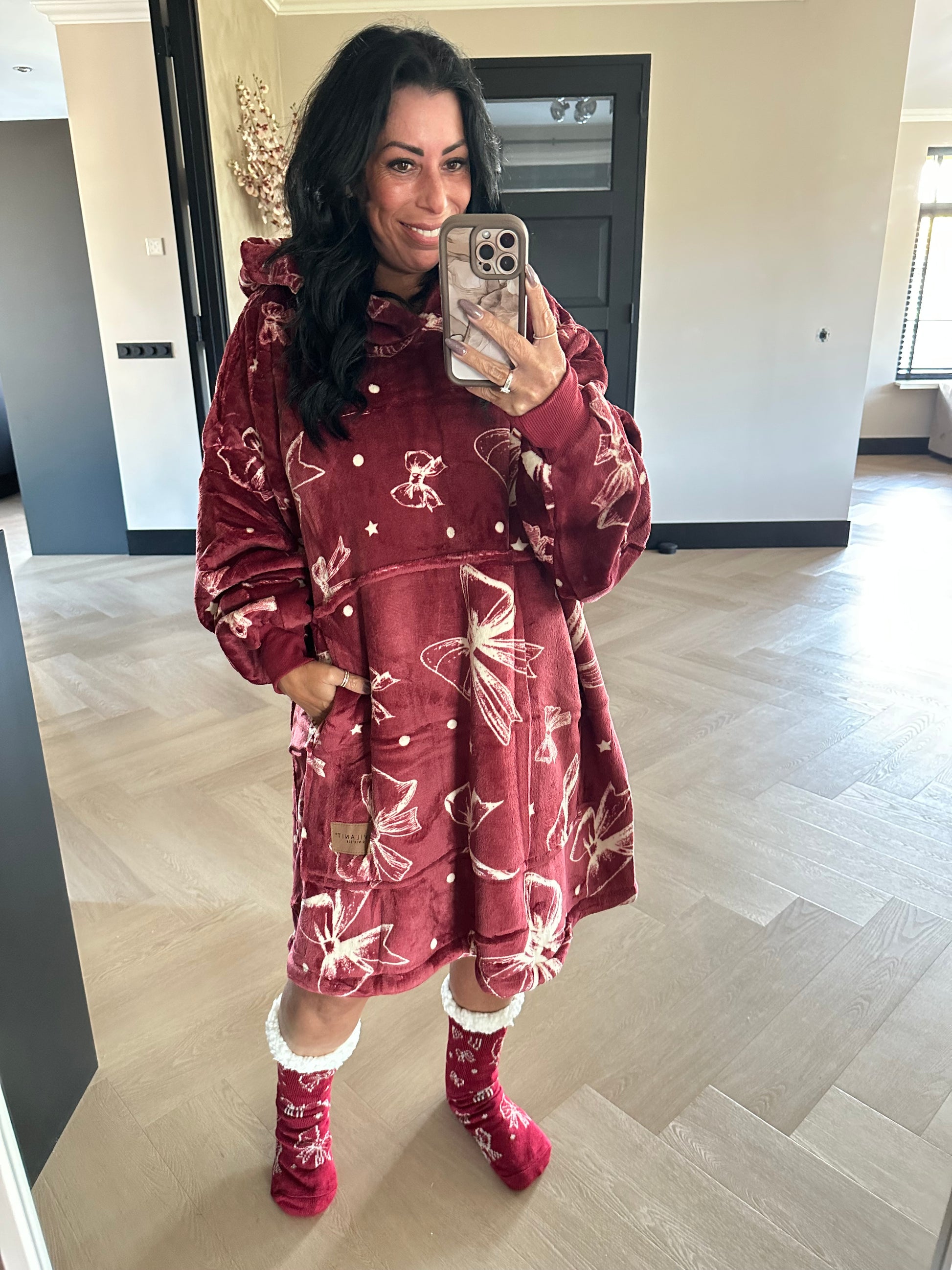 Hoodie en Deken in 1!! Deze heerlijke zachte knuffel hoodie is niet alleen geschikt om lekker op de bank te liggen, maar je kunt er dus ook gewoon in rondlopen!! De Binnenkant is voorzien van Sherpa Fleece, dus extra dik. Inclusief bijpassende sokken.